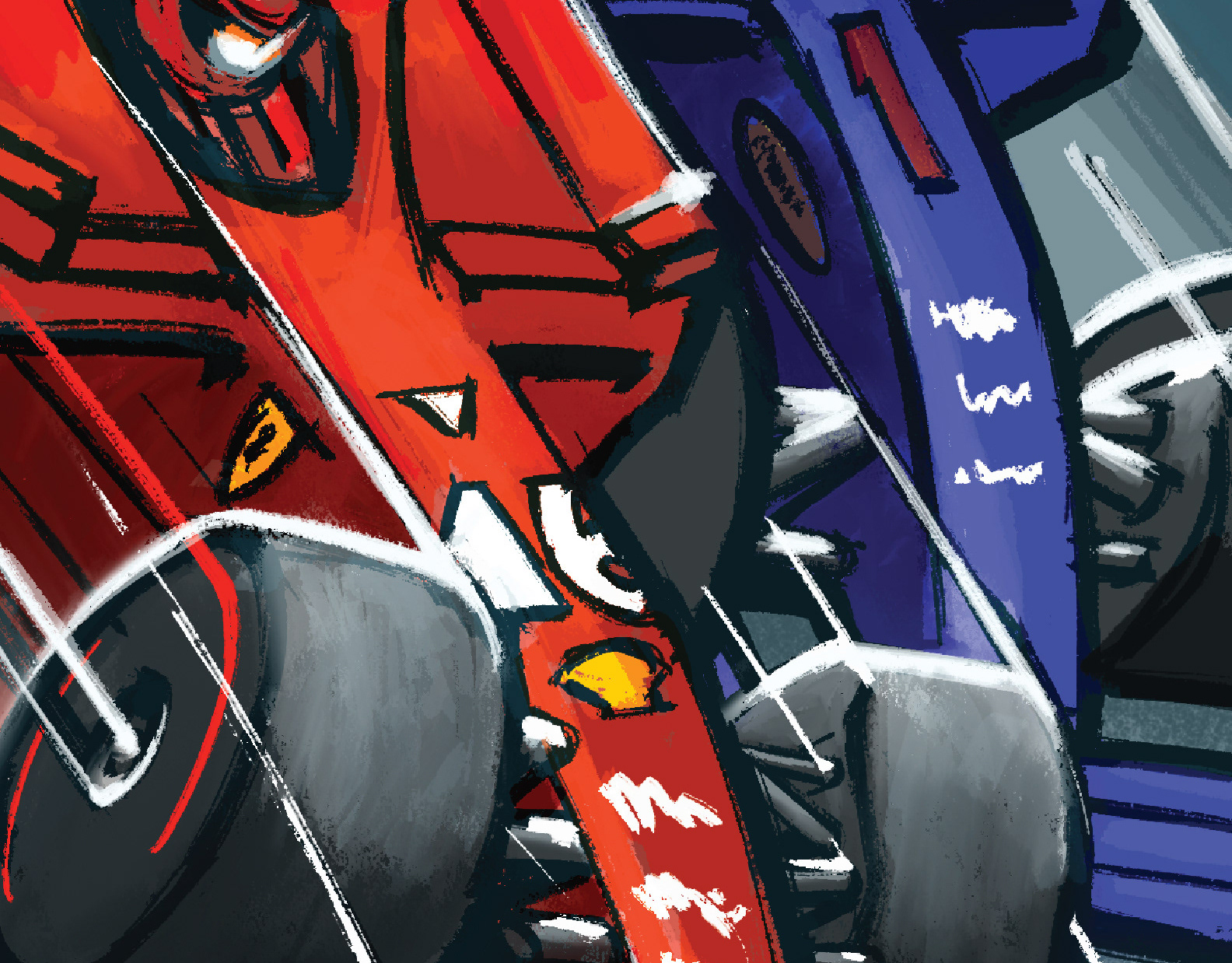 An illustration of Formula 1's most famous venue in the style of old. The illustration is based on a 2000 era Ferrari, piloted by Michael Schumacher. Additional illustrations are current 2017 era.