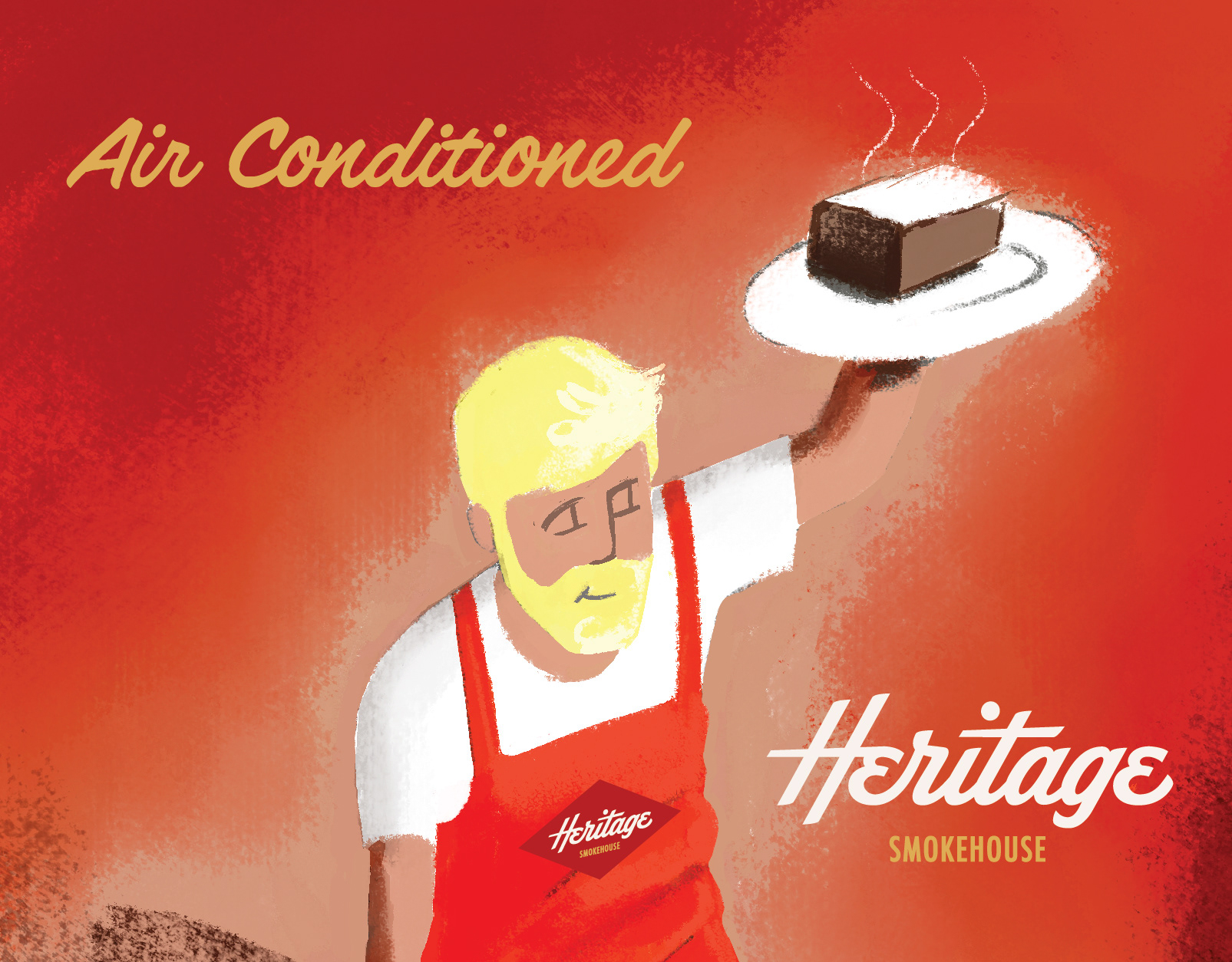 A conceptual illustration of Heritage Smokehouse proprietor, George, serving the hungry people.