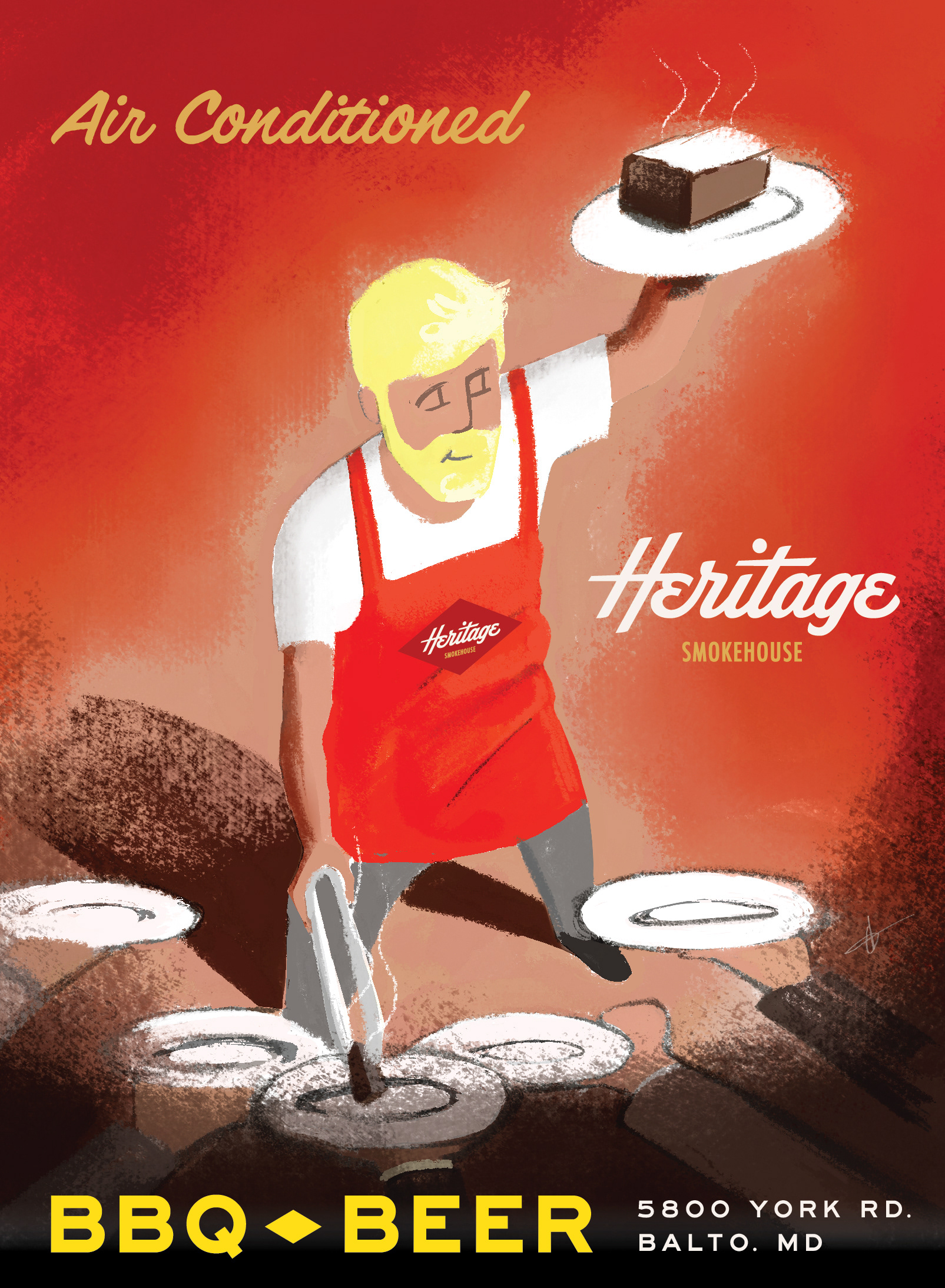 A conceptual illustration of Heritage Smokehouse proprietor, George, serving the hungry people.