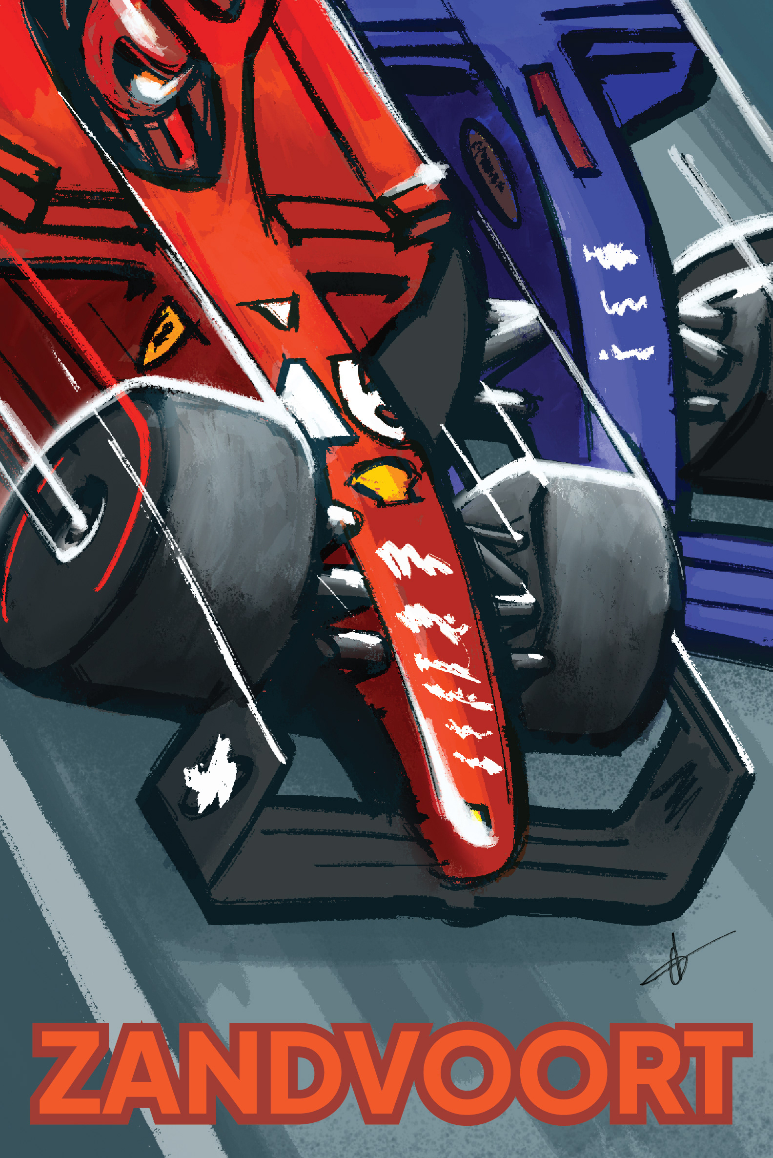 An illustration of Formula 1's most famous venue in the style of old. The illustration is based on a 2000 era Ferrari, piloted by Michael Schumacher. Additional illustrations are current 2017 era.